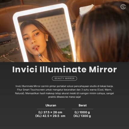 Invici Illuminate Mirror cermin pintar portabel solusi pencahayaan studio di lokasi kerja.  Fitur Smart Touchscreen untuk mengatur kecerahan dan 3 suhu
