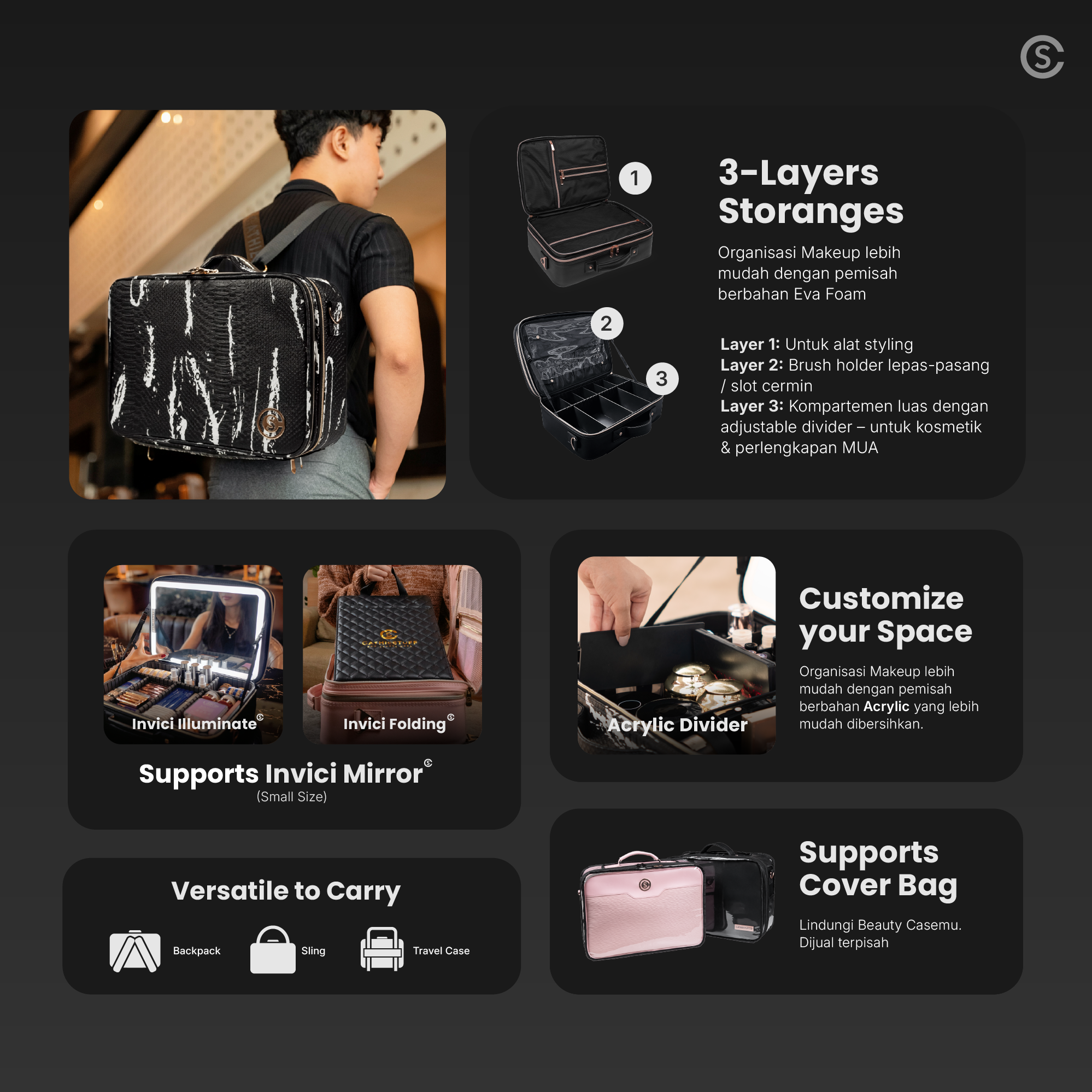 • Pro MUA: Muat banyak tools & perlengkapan penting, tetap terlihat profesional & rapi saat bekerja di client besar, wedding, dan photoshoot.