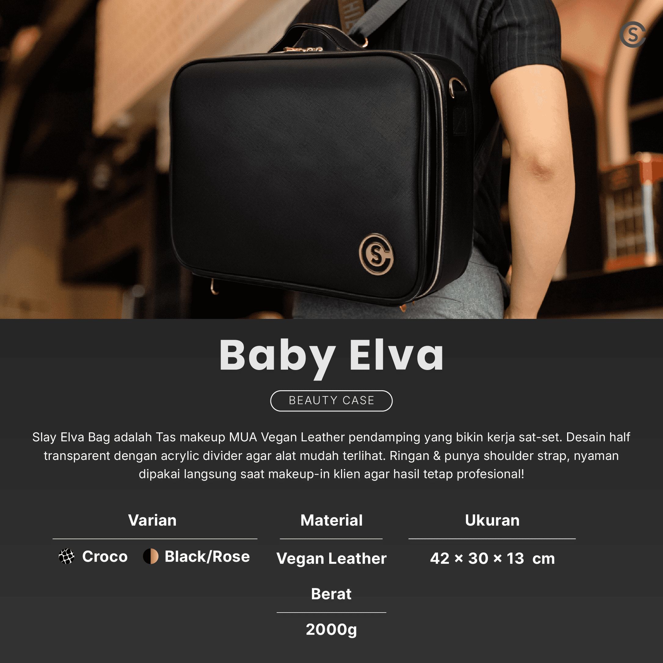 Baby Elva tas makeup MUA berukuran 42x30x13cm yang super ringan (±2 kg) untuk kerja lebih efisien. Sistem dua layer terpisah dan divider ABS Plastic yang lebih hemat ruang serta mudah dibersihkan. Material PU Leather premium, bisa hand carry atau selempang agar mobilitas kamu tetap nyaman!
