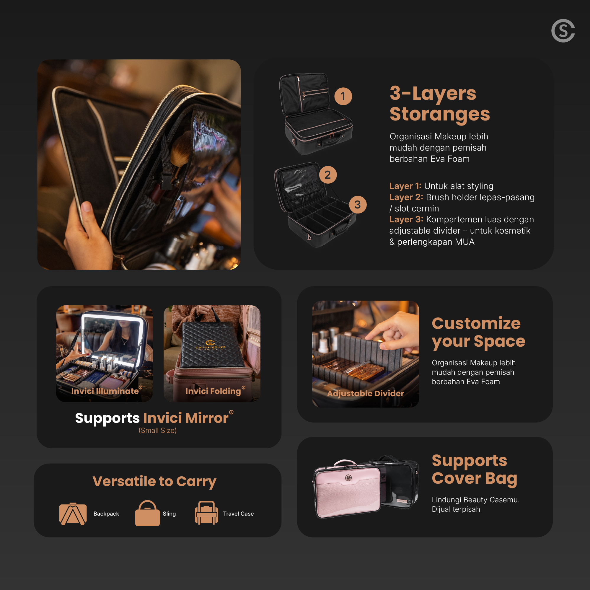 • Pro MUA: Muat banyak tools & perlengkapan penting, tetap terlihat profesional & rapi saat bekerja di client besar, wedding, dan photoshoot.