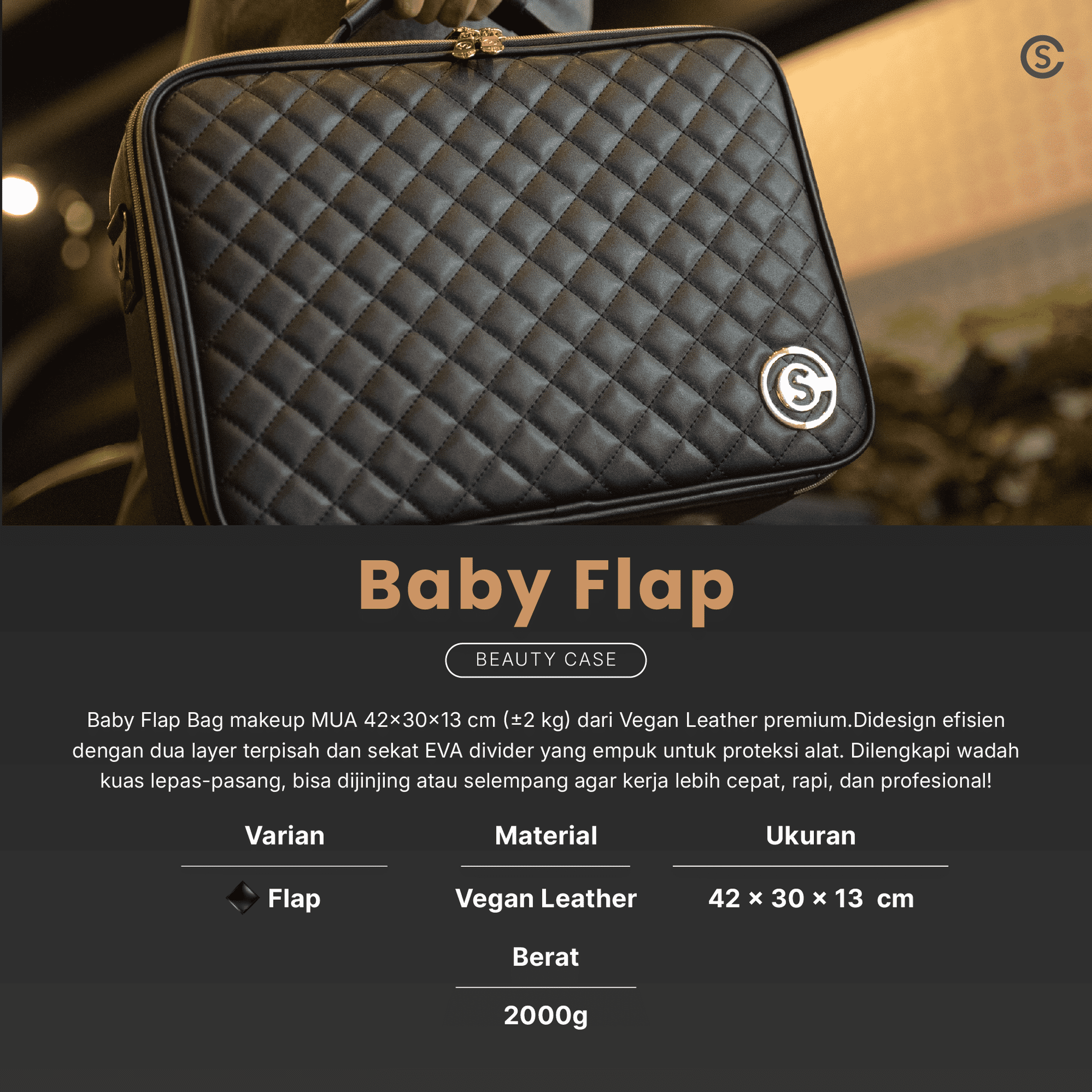 Baby Flap Bag makeup MUA 42x30x13 cm (±2 kg) dari PU Leather premium.Didesign efisien dengan dua layer terpisah dan sekat EVA divider yang empuk untuk proteksi alat. Dilengkapi wadah kuas lepas-pasang, bisa dijinjing atau selempang agar kerja lebih cepat, rapi, dan profesional!