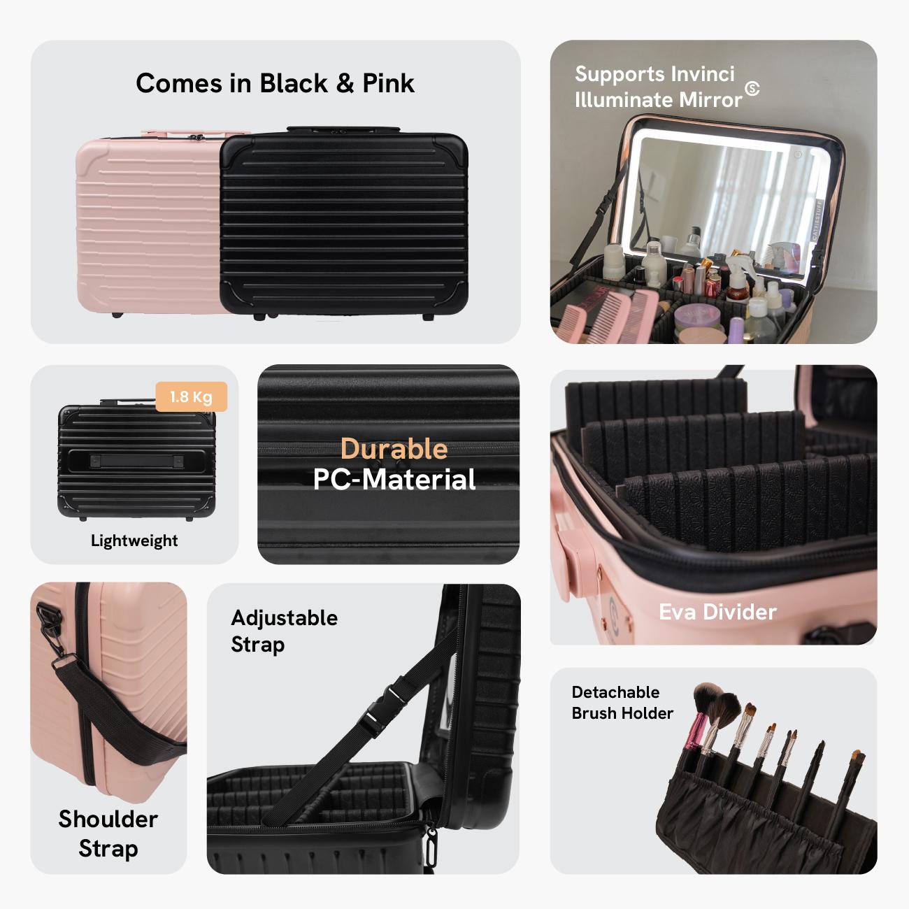 Bagian dalamnya juga memiliki foldable brush holder dan shoulder strap yang memudahkan Beauties membawa case ini ke mana saja. Tersedia juga tali elastis di bagian belakang, sehingga bisa ditempatkan di pegangan koper saat traveling.