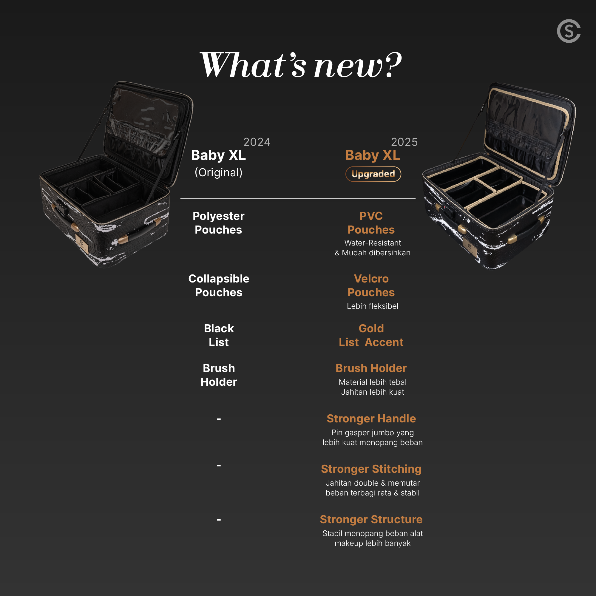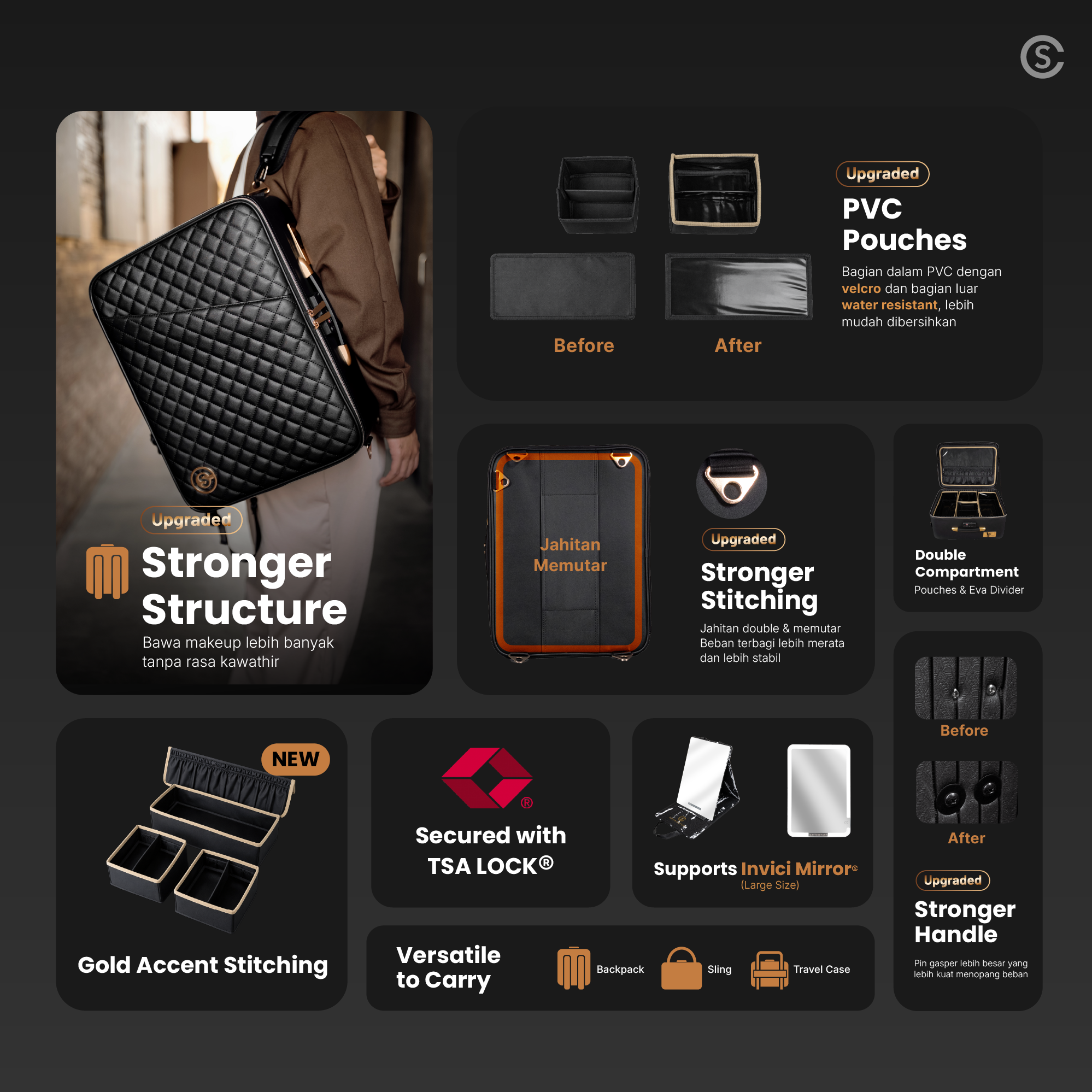 - Struktur backpack lebih kuat (Upgraded) –Â Stabil menopang beban alat makeup lebih banyak