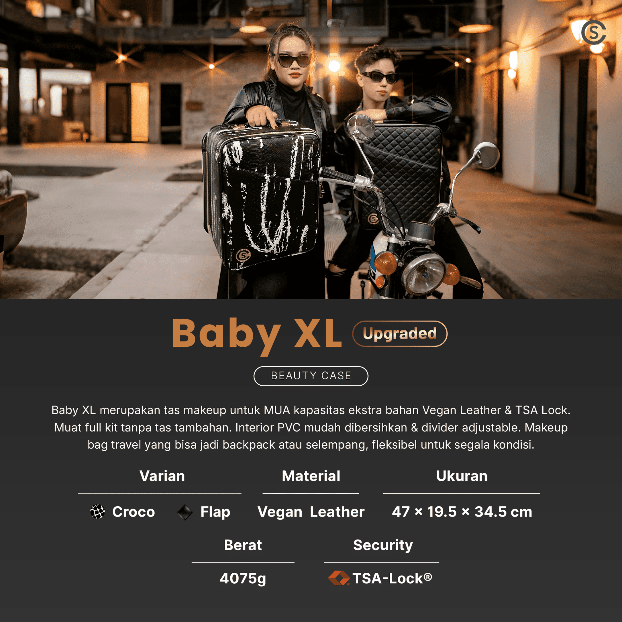 Baby XLÂ merupakan tas makeup untuk MUA kapasitas ekstra bahan PU Leather & TSA Lock. Muat full kit tanpa tas tambahan. Interior PVC mudah dibersihkan & divider adjustable. Makeup bag travel yang bisa jadi backpack atau selempang, fleksibel untuk segala kondisi.